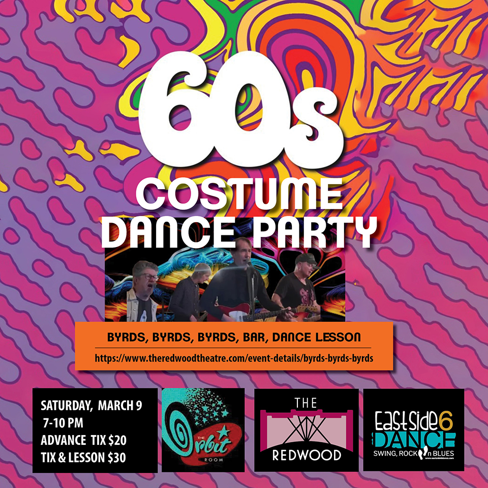 Come join us for a fun night out dancing at the historic RedWood theatre. Get groovy, baby, with a dance lesson from East Side 6 Dance at 7, followed by a 60s Dance Party and Concert with music of The Byrds. BYRDS, BYRDS, BYRDS featuring the iconic FERGUS HAMBLETON, TIM BOVACONTI, ANDY MAIZE, BOB McKITRICK and CLEAVE ANDERSON.